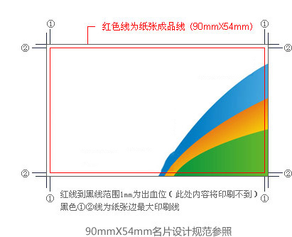 1.文件尺寸: 名片成品尺寸为:54×90mm,则印刷文件尺寸需为:56x92mm(名片设计稿件需在图片上下左右各添加1mm出血);也支持名片成品尺寸
